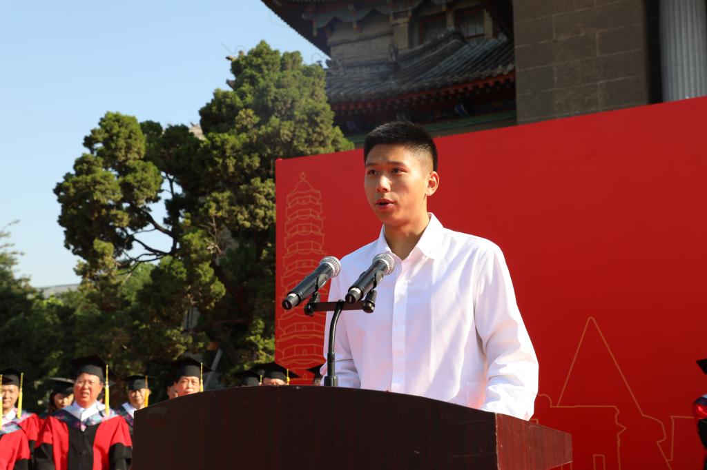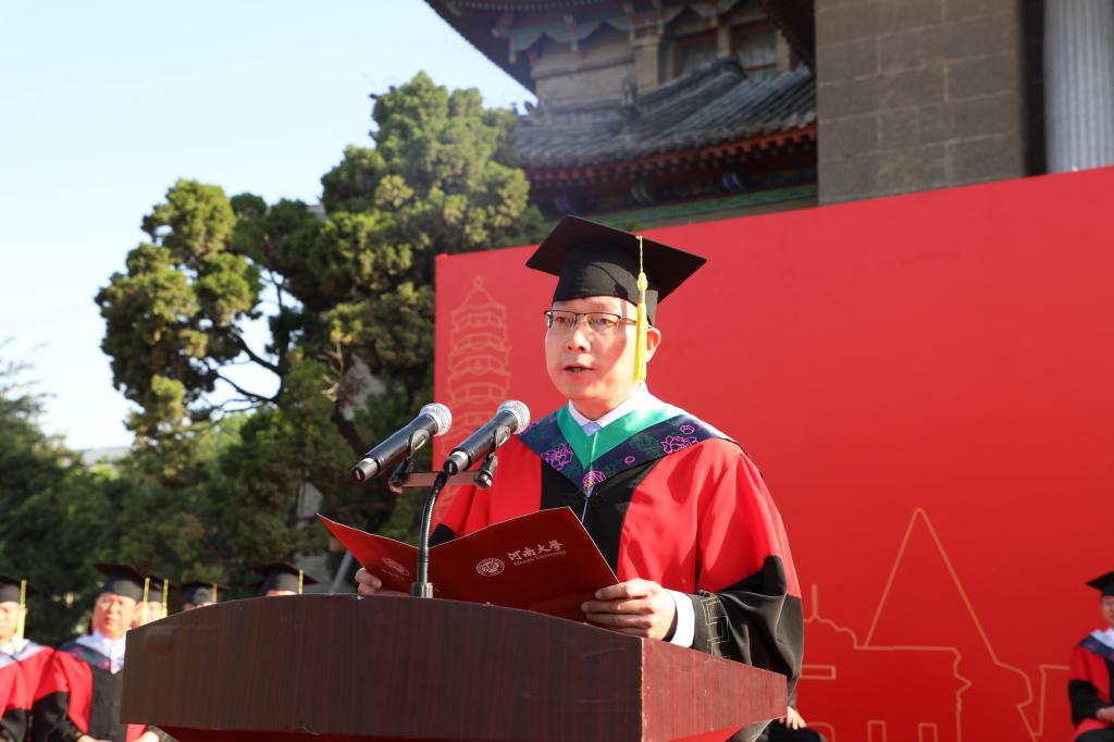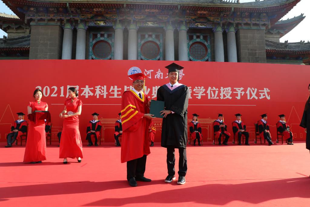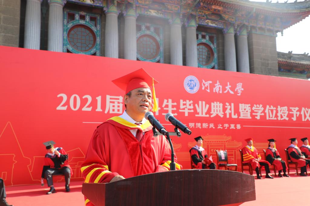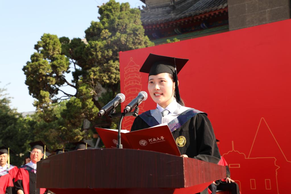 “作为河大学子,我们要始终铭记‘明德新民,止于至善’的校训,心怀国家社稷、拥有浩然正气;作为新时代青年,我们要牢记习近平总书记 ‘立大志、明大德、成大才、担大任’的嘱托,肩负历史使命,坚定理想信心,努力成为堪当民族复兴重任的时代新人!”毕业生代表、已顺利保送至清华大学的生命科学学院2017级生物科学明德实验班学生于学荣发言,细数在校学习四年期间的种种感动与收获,话语里溢满对母校的无限感恩之情。