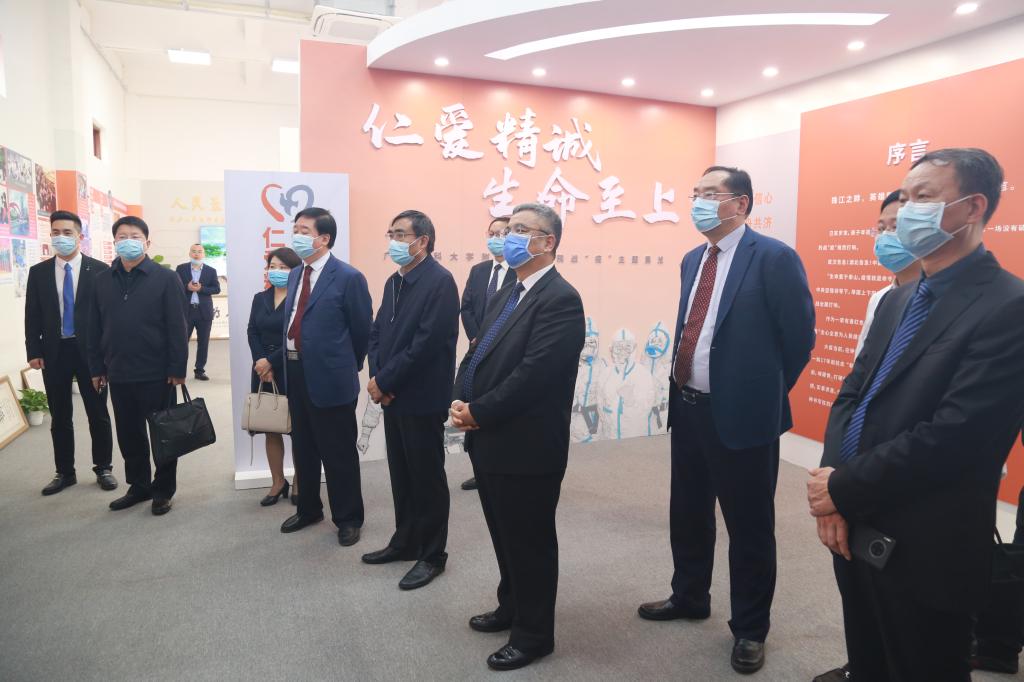 签约仪式前,与会人员共同参观了广州医科大学附属第一医院战“疫”主题展览。签约仪式后,宋纯鹏向钟南山赠送了河南大学带给广州呼吸健康研究院的礼物,即王立群的书和汴绣等。